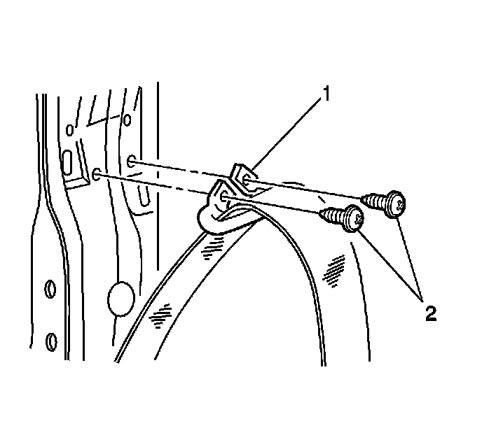 2. Install the intermediate seat belt guide (1) to the vehicle. Secure the guide with the screws (2).