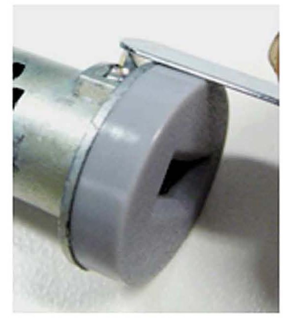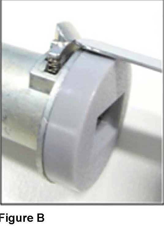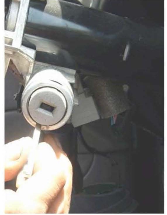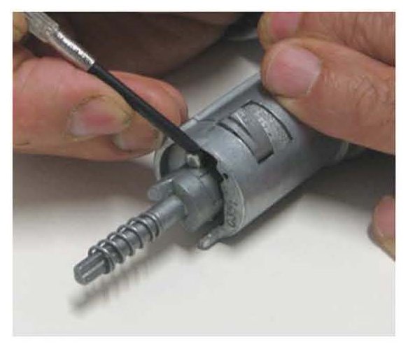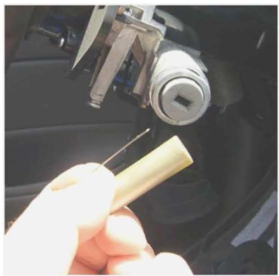1. With the key out of the ignition, slide the tool down between the lock barrel and the lock housing. There is a small notch in the lip around the cylinder housing at the bottom of the housing. The slider pin is located approximately 4 mm (0.16 in) clockwise from this notch. Figure A
