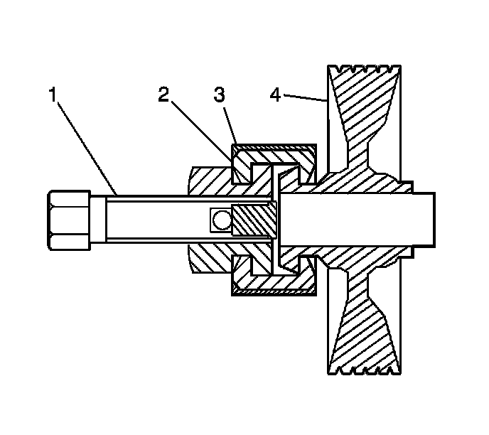 4. Position the half jaws (2) of the OTC 7185 kit, or equivalent, on the pulley (4). Ensure the full diameter end of the half jaws are engaged with the pulley. Ensure the larger open end diameter, which has a chamfer and relief profile, engages with the pulley flange.