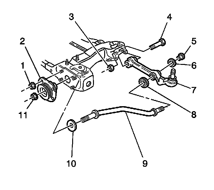 3. Loosen the nut (11) that retains the front lower control arm rod (9) to the front lower control arm rod insulator bushing (2).
