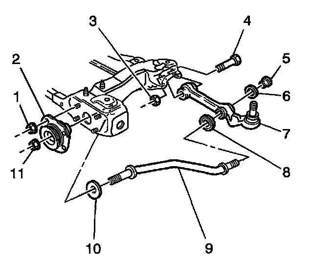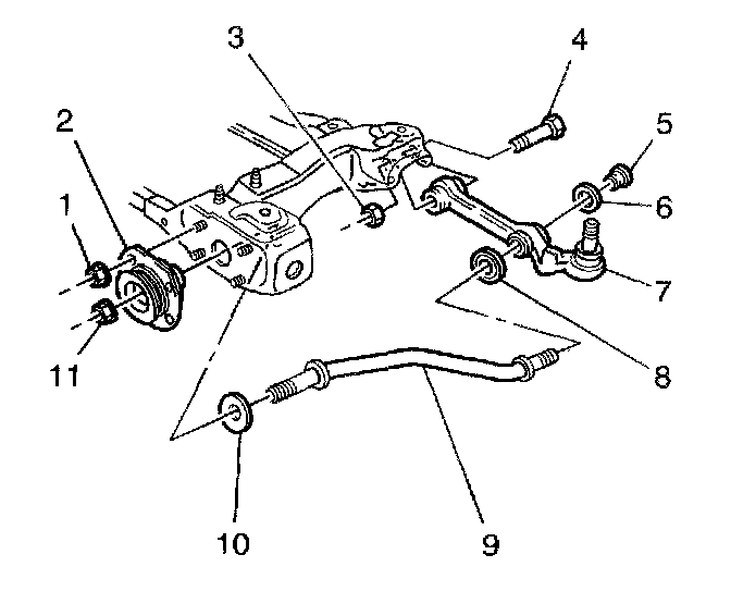 3. Loosen the nut (11) that returns the front lower control arm rod (9) to the front lower control arm rod insulator bushing (2).
