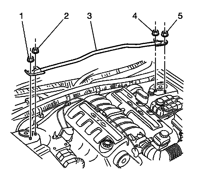 1. Remove the 4 nuts (1,2,4,5) that retain the front suspension support brace (3) to the strut towers.