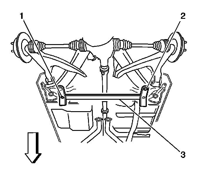 9. With the aid of an assistant, position the rear suspension support. The locating pins (2) of the CH-46839 engage the alignment holes in the rear suspension support.