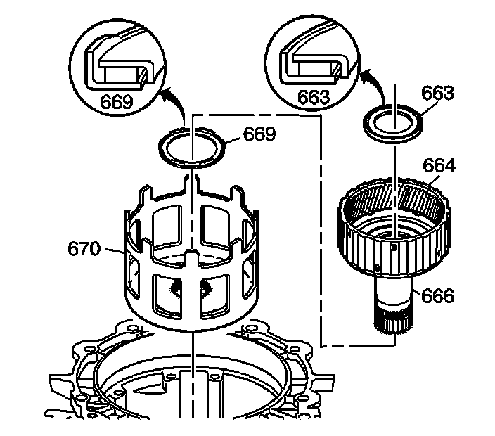 3. Install the input internal gear (664) and reaction carrier shaft (666) assembly into the sun gear shell. Index the reaction carrier shaft spline into the reaction carrier.
