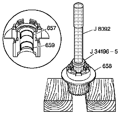 1. Using J 34196-4 which is part of kit J 34196-B with J 8092, install the input sun gear front bushing (657).