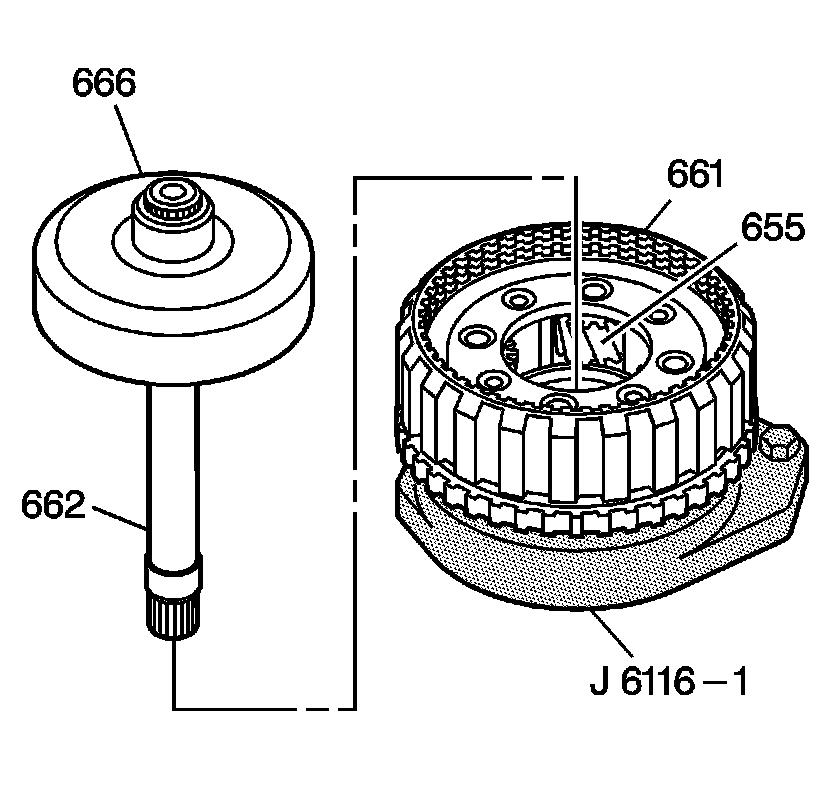 8. Install the main shaft (662) and the rear internal gear (666) into the output carrier assembly (661).