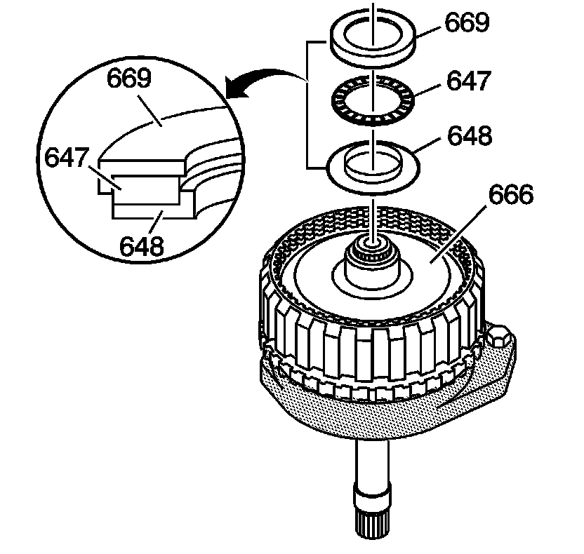 10. Assemble the rear internal gear thrust bearing assembly (647) and races (648, 669). The lips of the sun gear thrust bearing races (648, 669) should face the rear internal gear thrust bearing assembly (647).