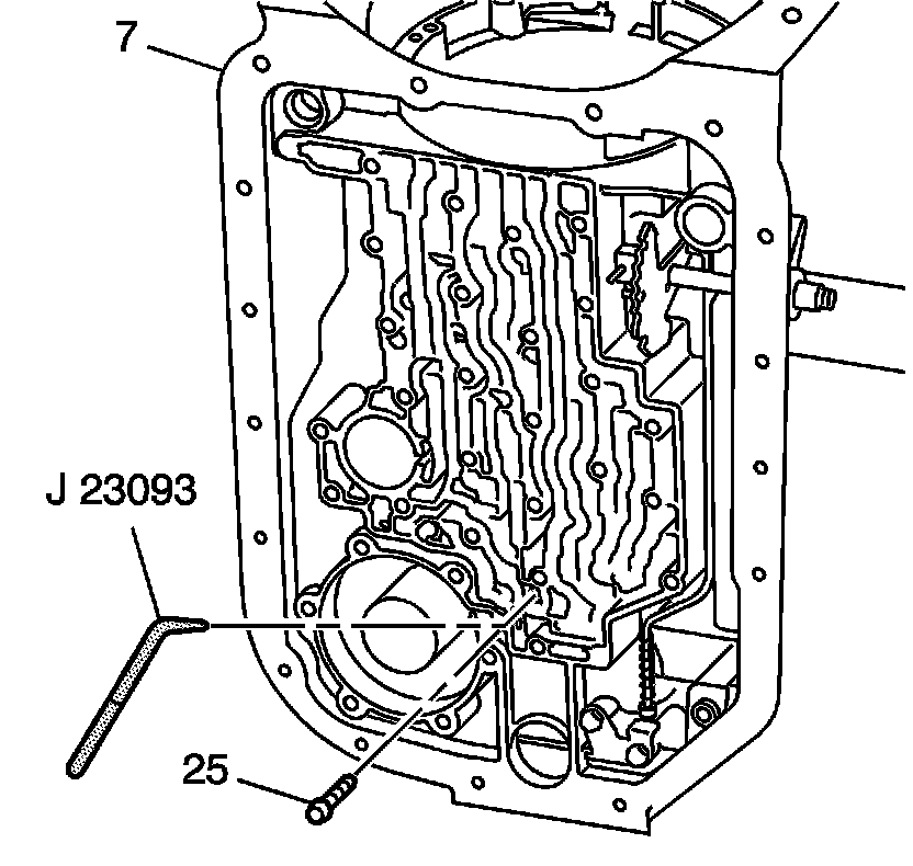 Using the J 23093, locate the center support 2nd clutch fluid passage through the hole in the case bottom. Refer to Fluid Passages, Case Fluid Passages illustration.