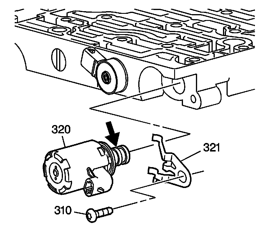 Remove the pressure control solenoid clamp bolt (310) and clamp (321).