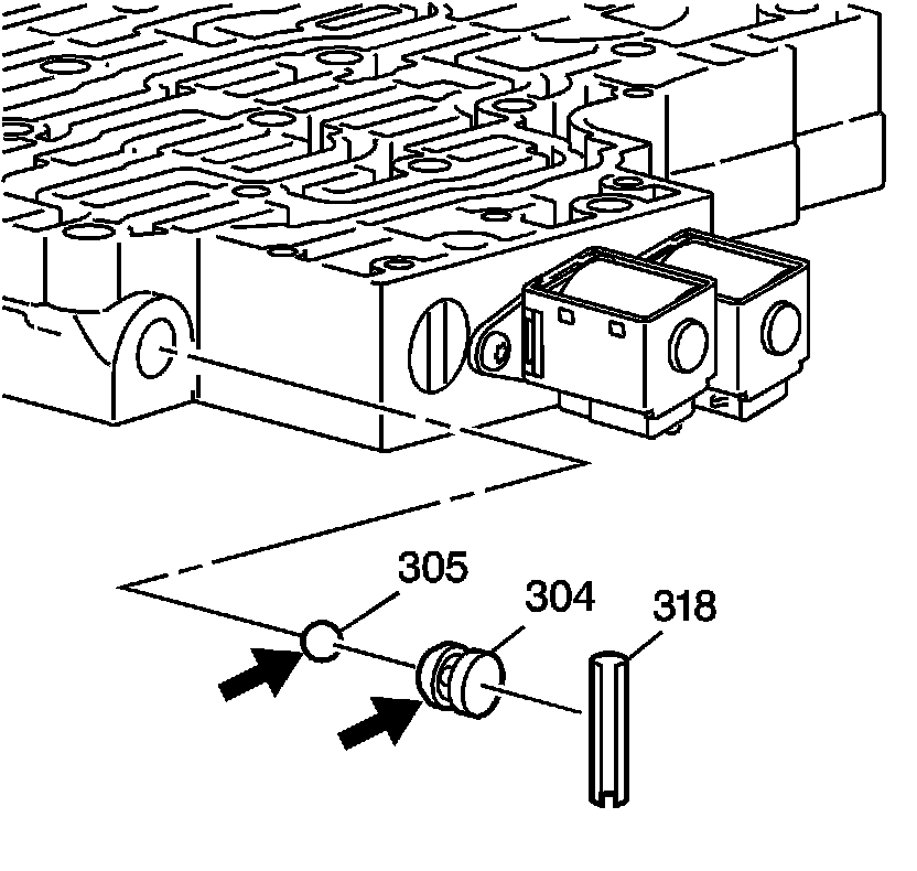 6. Remove the TCC regulator apply valve pin (303). Use a drill bit to remove the spring pin.