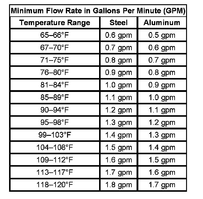 3. Refer to the table below. Using the temperature from step 1, locate on either the Steel MINIMUM Flow Rate table or the Aluminum MINIMUM Flow Rate table the minimum flow rate in gallons per minutes (GPM). Record the minimum flow rate in GPMs and the supply fluid temperature for further reference.