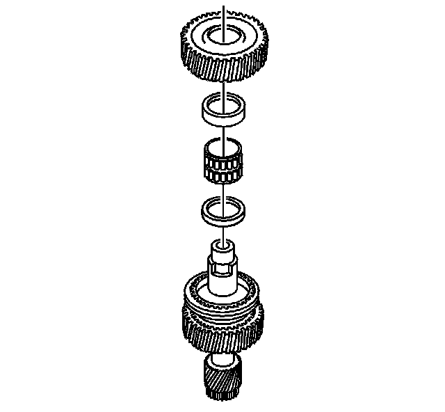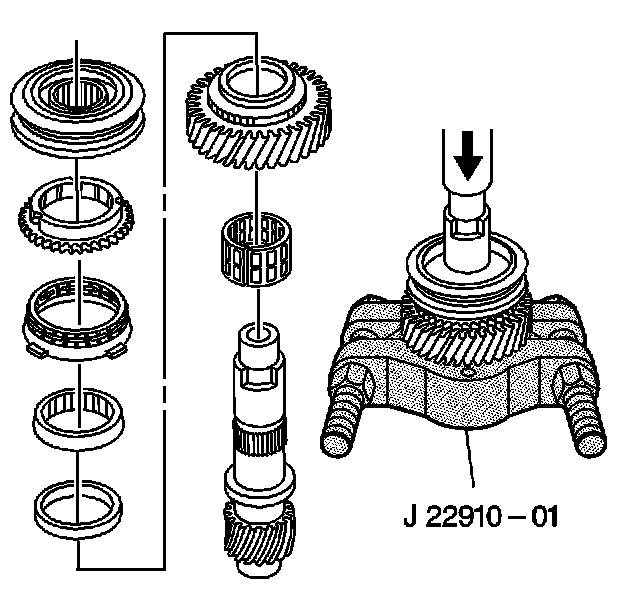 5. Remove the 5th speed drive gear, using the J 22910-01 and a hydraulic press. The 5th/6th speed synchronizer assembly, and the 5th speed drive gear blocking ring, friction cone, inner cone and thrust washer will press off with the 5th speed drive gear.