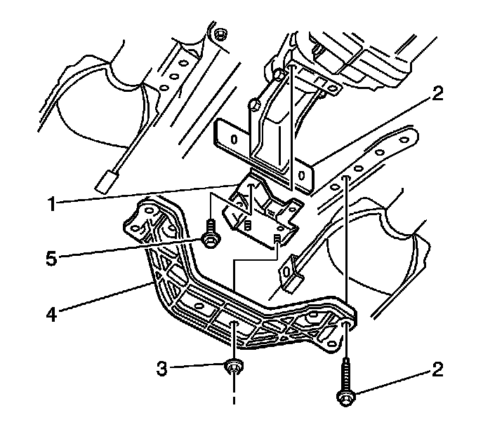 5. Remove the 2 transmission mount nuts (2) from the crossmember support.