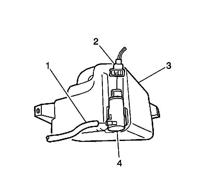 4. Place a container under the washer solvent container (3), and disconnect the washer hose (1) from the washer pump assembly (4).