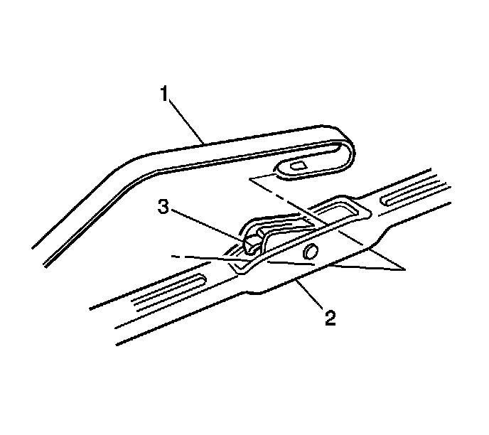 2. Remove the wiper blade assembly (2) from the wiper arm (1) by lifting up the retainer (3) on the wiper blade assembly (2) and pulling the wiper blade assembly (2) from the wiper arm (1).