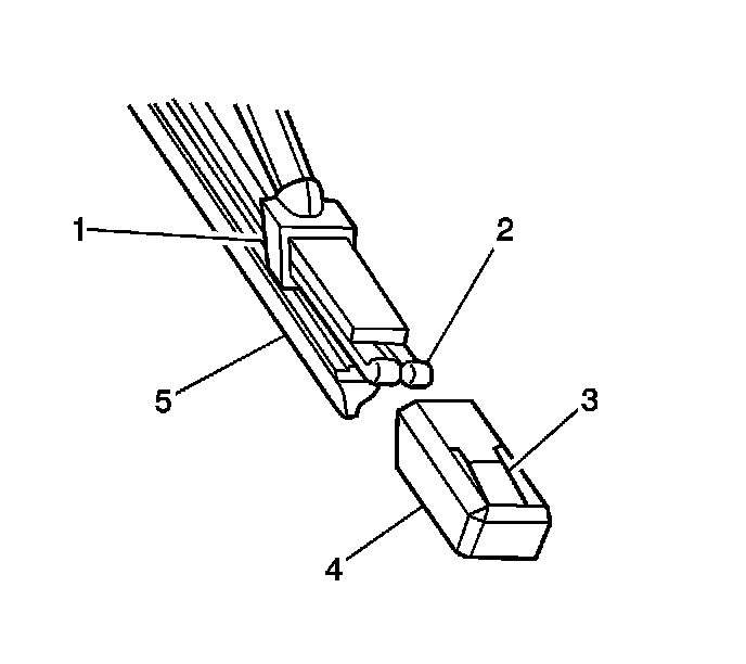 2. Assemble the new cap (4) onto each end of the wiper element (5), ensuring that the retention lug (3) on the end caps (4) are located securely behind the two upturned ends of the metal rails (2).