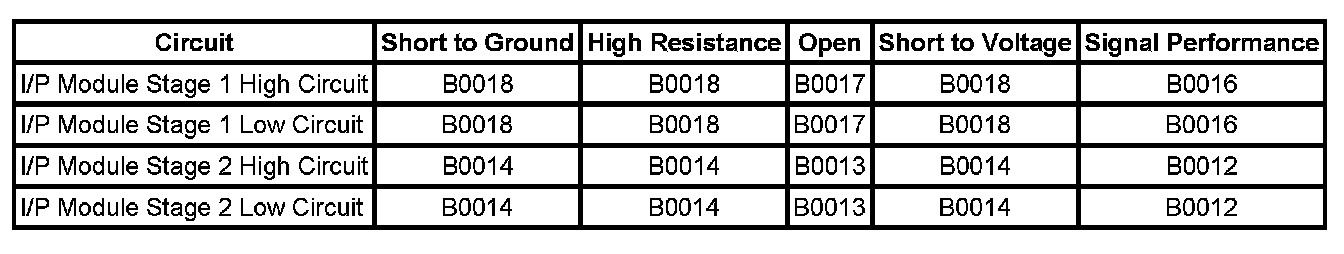 - The I/P module stage 1 or stage 2 high and/or low circuits is short to ground or short to voltage for 500 milliseconds.