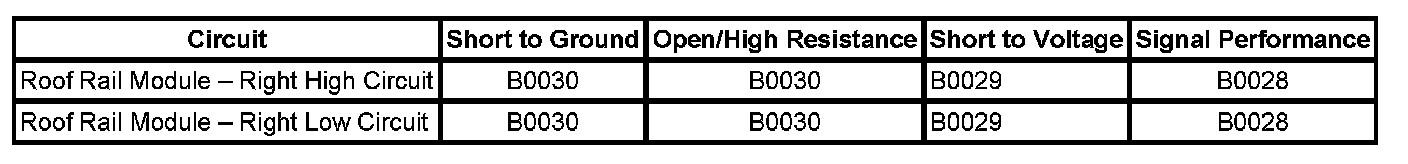 - Roof rail module - right high and/or low circuits is short to ground or short to voltage for 500 milliseconds.