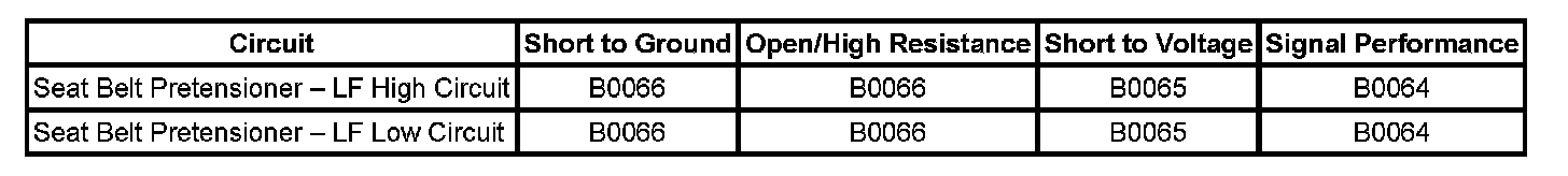 - Seat belt pretensioner - LF high circuit is less than 2.4 volts and the seat belt pretensioner - LF deployment loop is more than 6 ohms for 500 milliseconds.