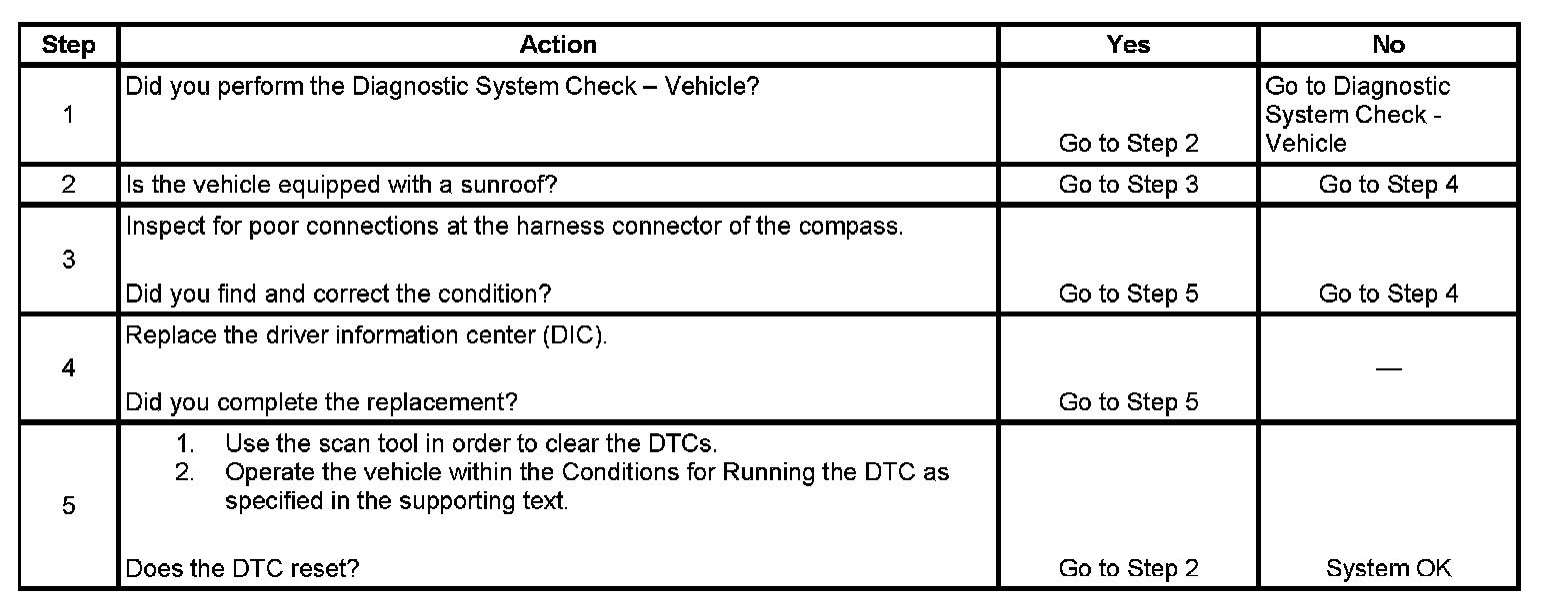 The DIC does not detect the compass sensor. This may be due to a faulty sensor or a remote sensor, sunroof only, that is not connected to the DIC.