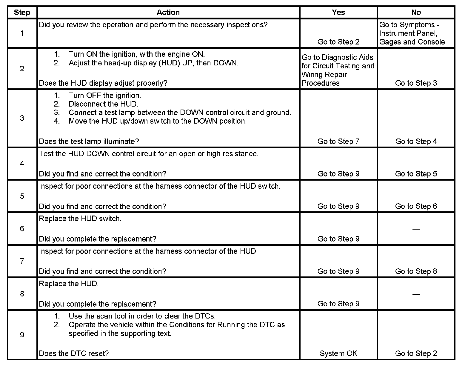 The head-up display (HUD) detects that the HUD Information Down signal circuit is low for greater than 60 seconds. The HUD monitors the switch signal circuits in order to perform various functions. The HUD switch contains 3 active low momentary switches, and a variable resistor. The HUD detects a switch activation when the signal circuit is active.