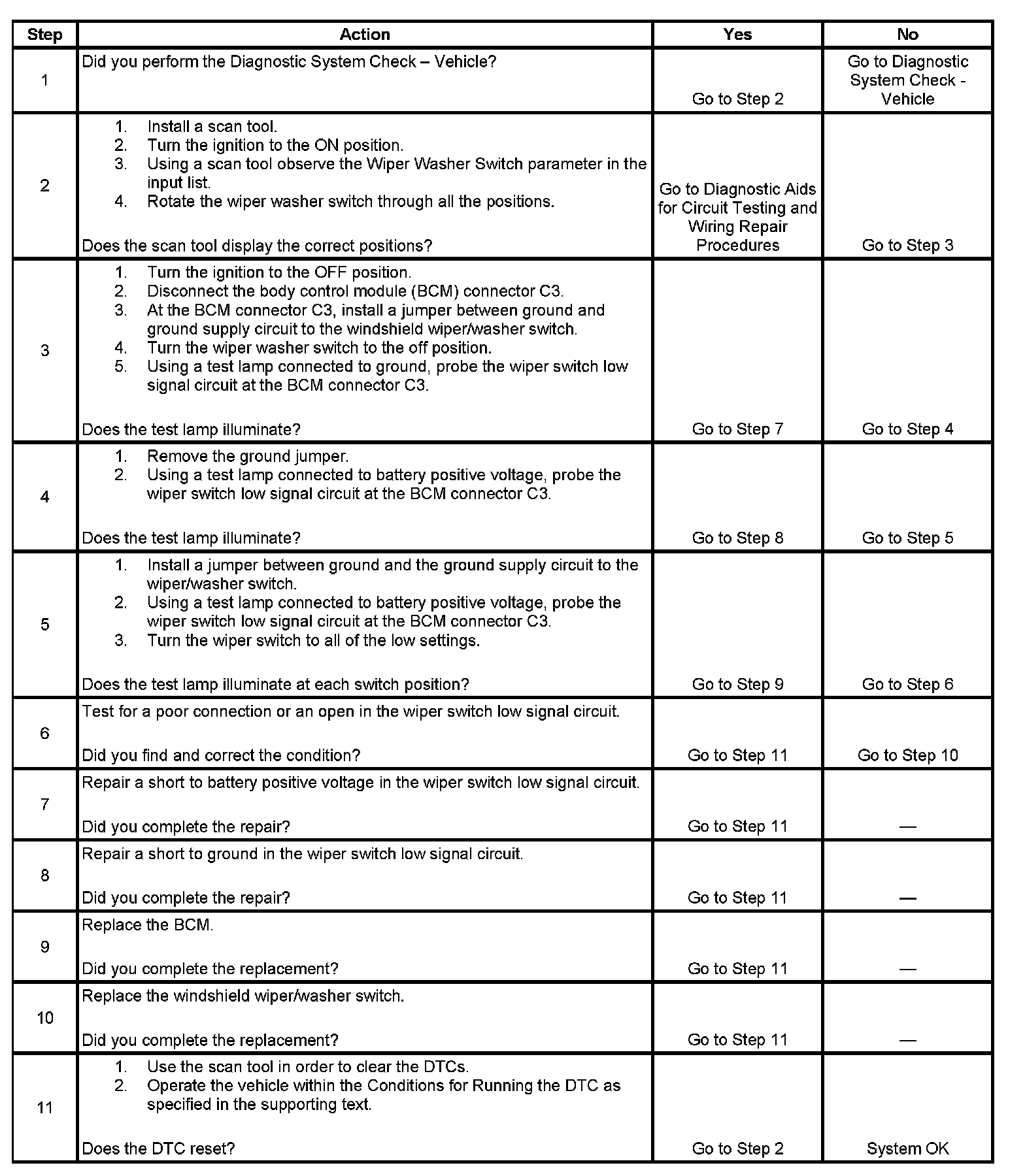The BCM detects an short to battery positive voltage on the windshield wiper switch low signal circuit.