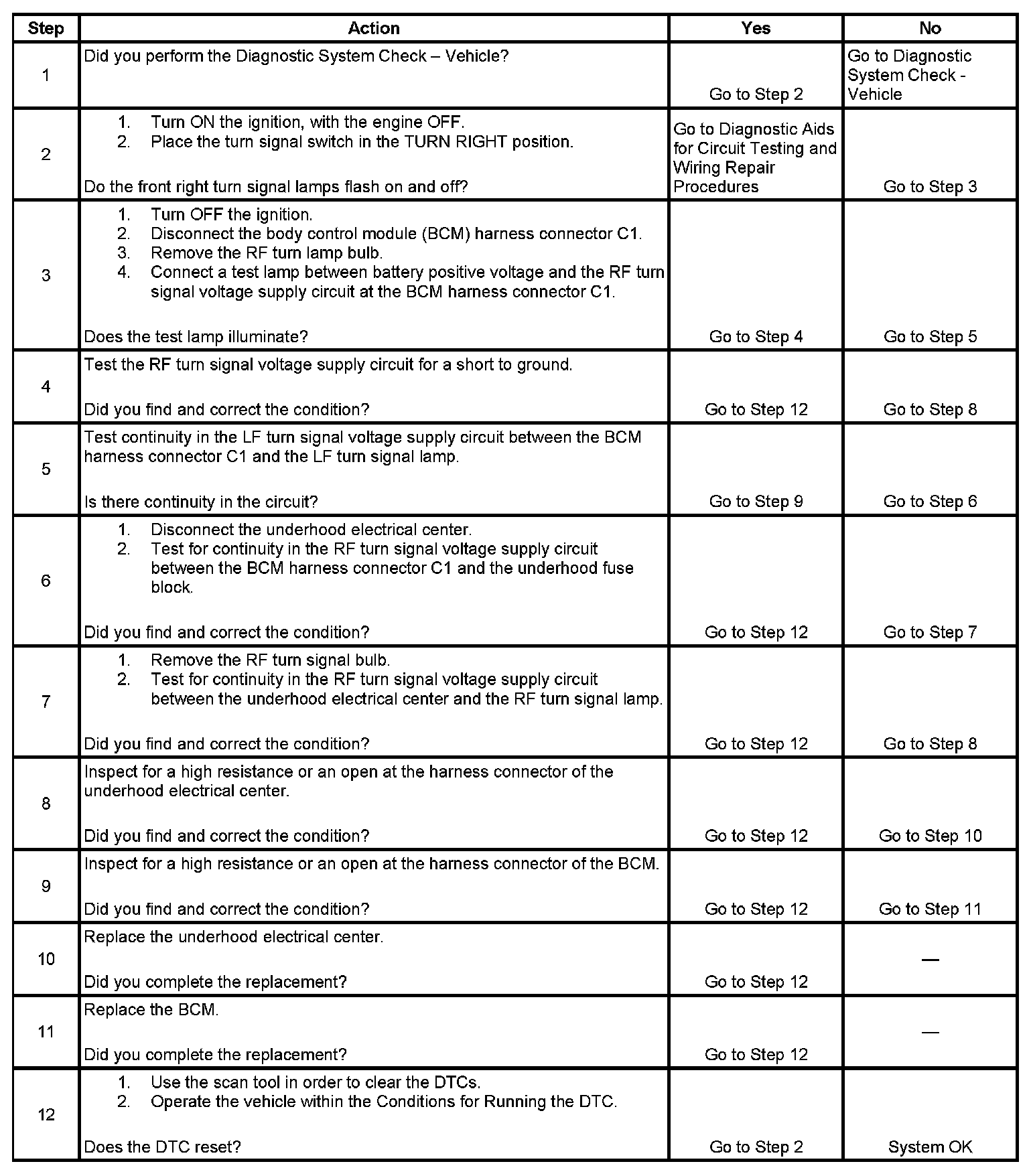 Ground is applied to the turn signal switch. When the turn signal switch is placed in the turn right position, ground is applied to the body control module (BCM) through the right turn signal switch circuit. The BCM applies a pulsating voltage to the RF and RR turn signal lamps through the RF and RR turn signal voltage supply circuits.
