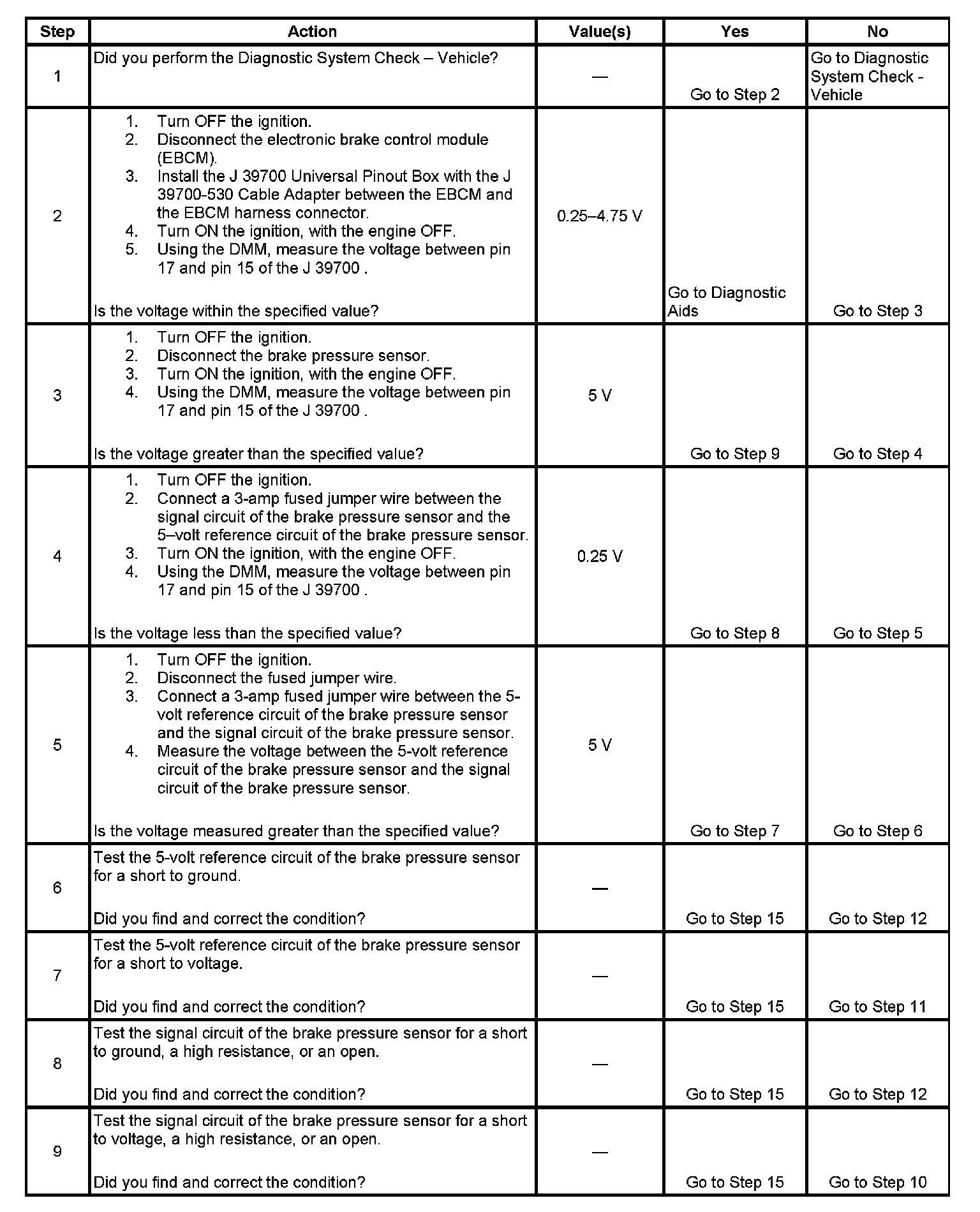 9. This step tests for a short to voltage, a high resistance, or an open in the brake pressure sensor signal circuit.