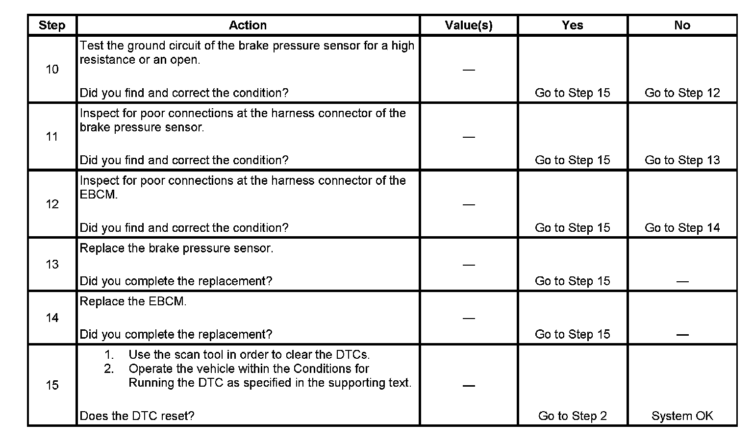 10. This step tests for a high resistance or an open in the ground circuit of the brake pressure sensor.