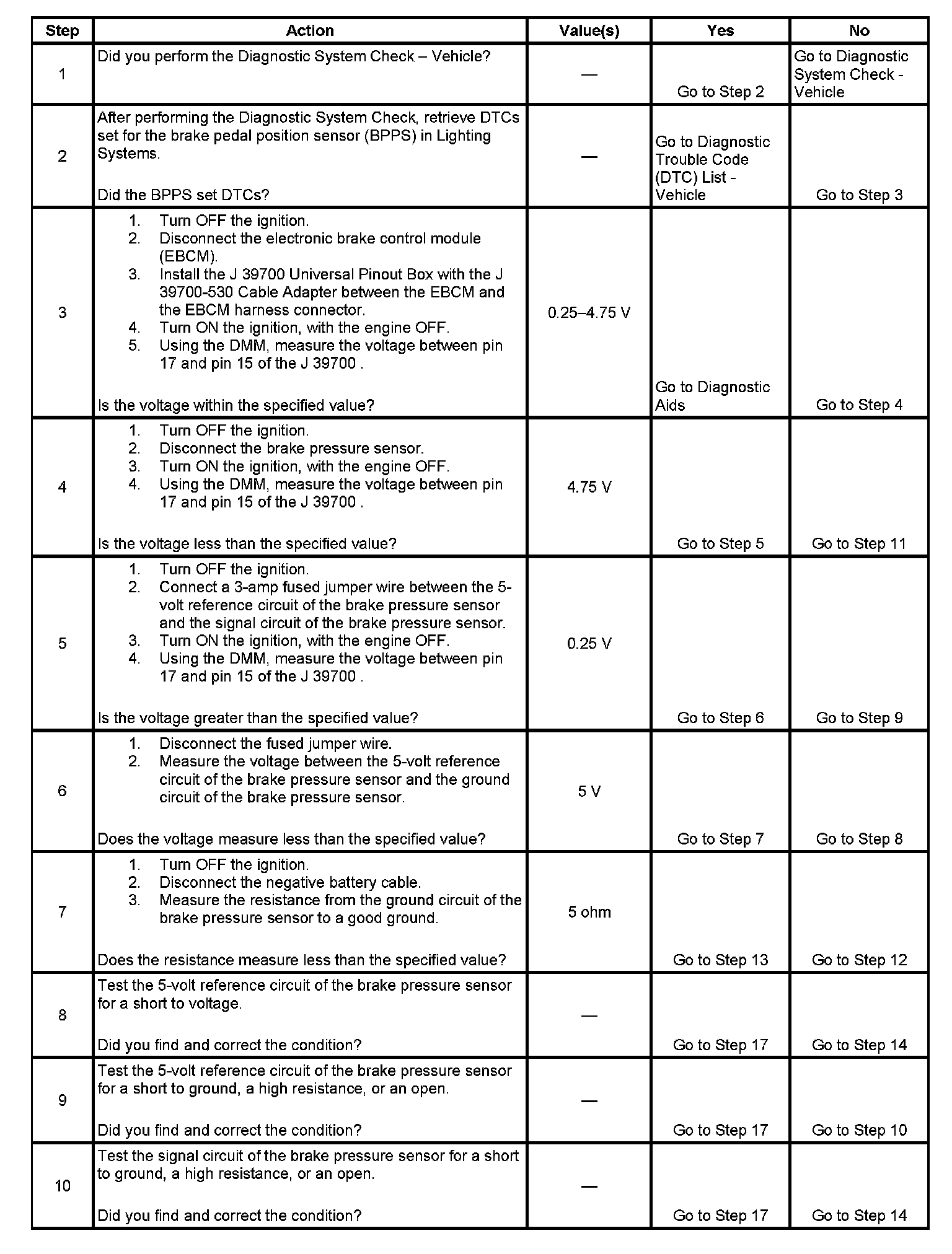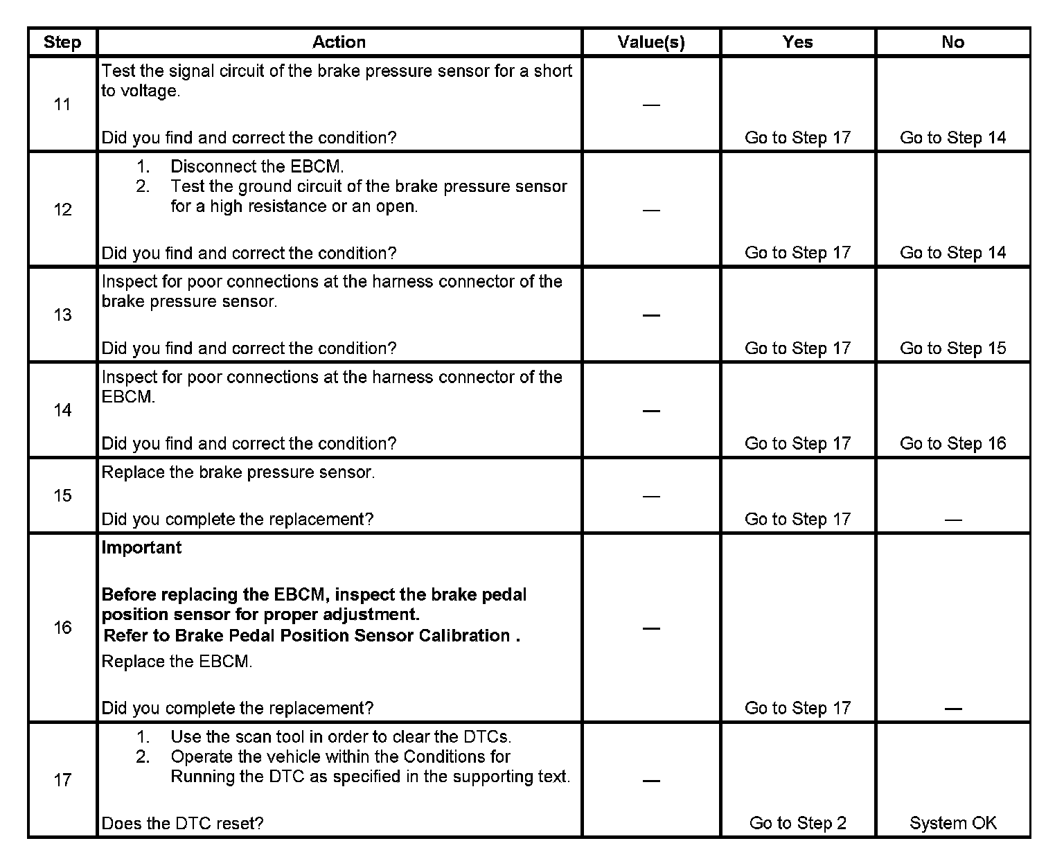 11. This step tests for a short to voltage in the brake pressure sensor signal circuit.