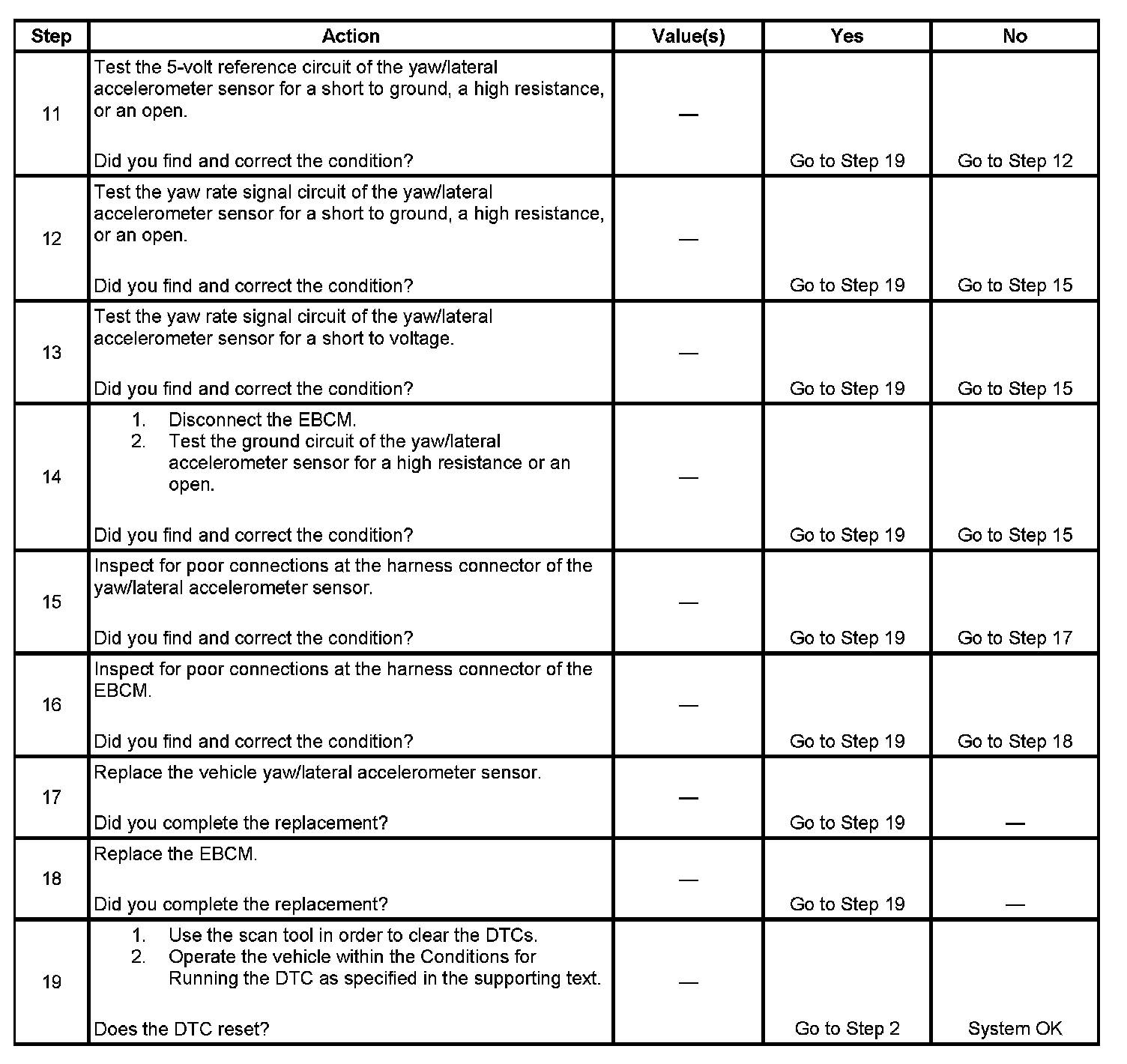 13. This step tests for a short to ground, a high resistance, or an open in the yaw rate signal circuit.