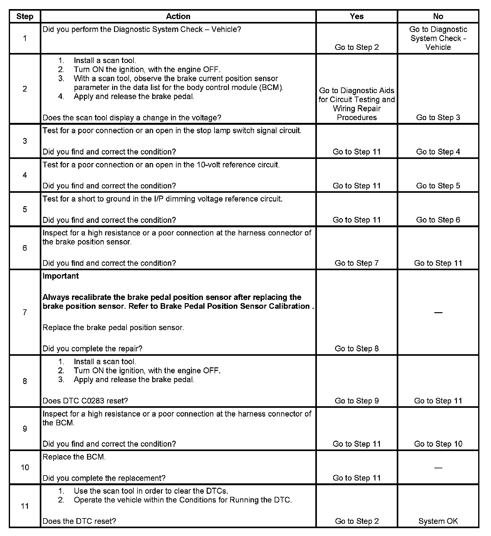 DTC C0283 Brake Pedal Position Sensor Circuit Low