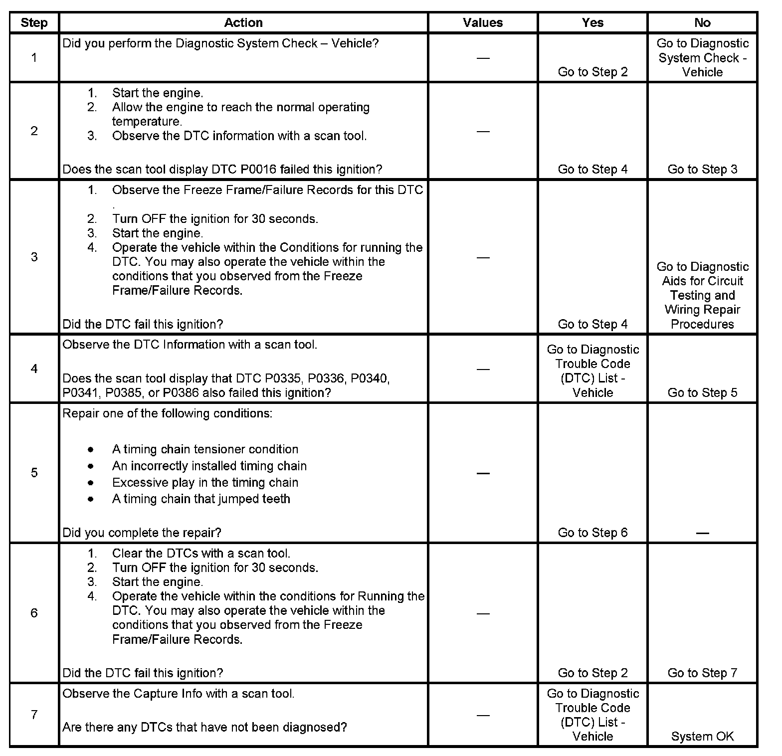 5. This step inspects for any recent engine mechanical repairs. An incorrectly installed camshaft, crankshaft or timing chain can cause this DTC to set.