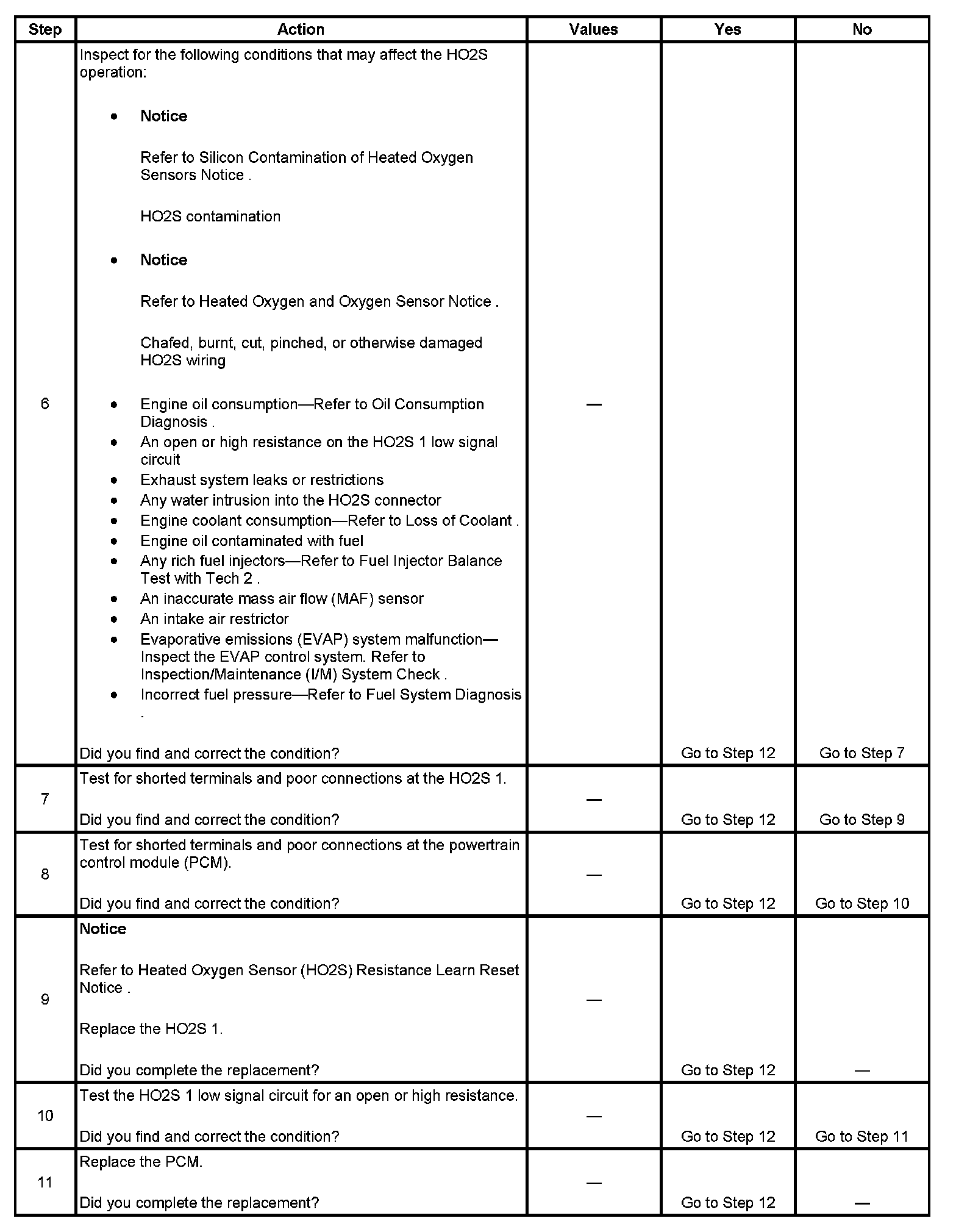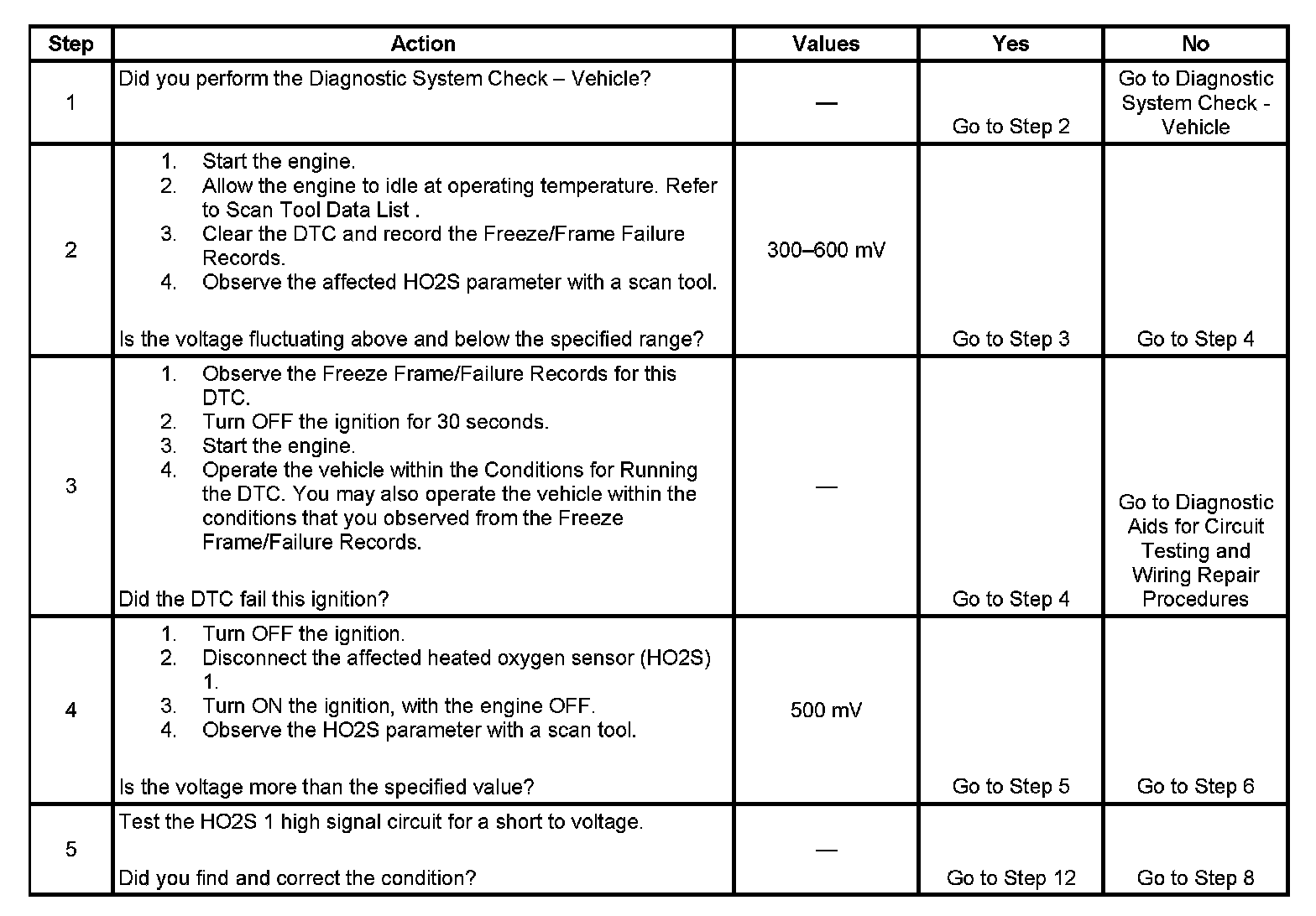 If the PCM detects that the HO2S B1 S1 voltage remains above a calibrated voltage for an excessive amount of time, the following DTCs will set: