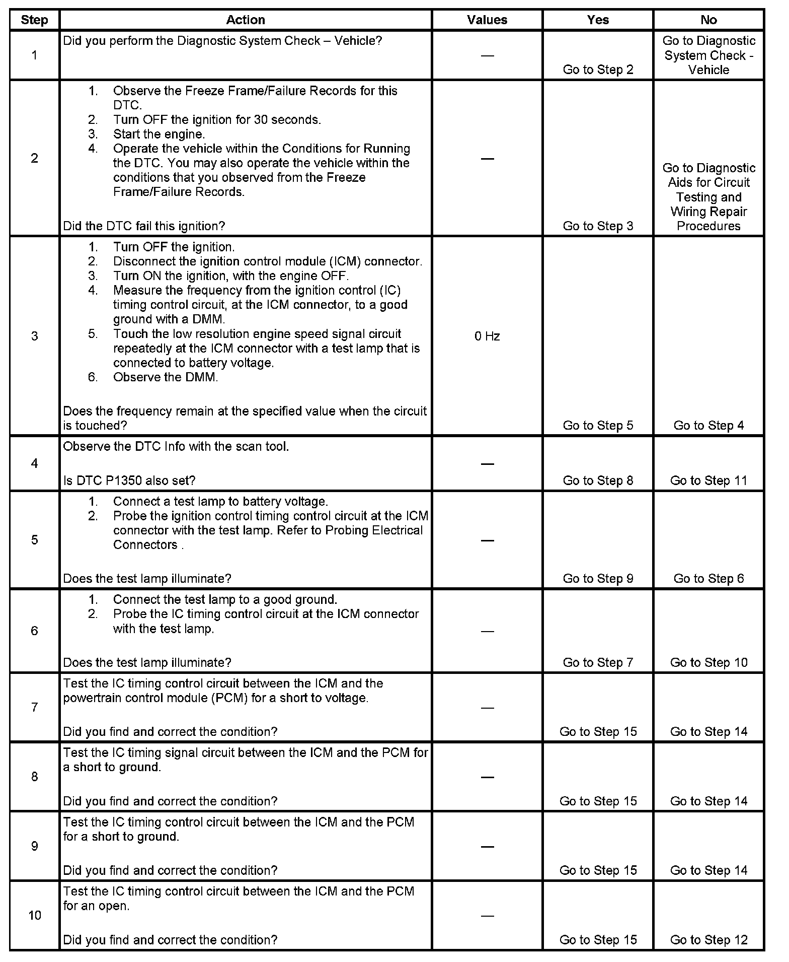 The PCM sends spark timing signals to the ICM on the IC timing control circuit, but during cranking the ICM grounds these signals. When the PCM begins receiving the 3X reference pulses from the ICM and the engine starts, the PCM applies 5 volts to the IC timing signal circuit allowing the ICM to switch to the IC mode of operation and respond to the spark timing signals from the PCM. The PCM monitors the IC timing control circuit for errors. If the PCM detects a fault, DTC P0350 sets.