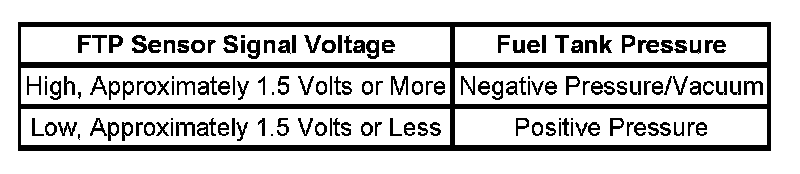 The table illustrates the relationship between the FTP sensor signal voltage and the EVAP system pressure/vacuum.