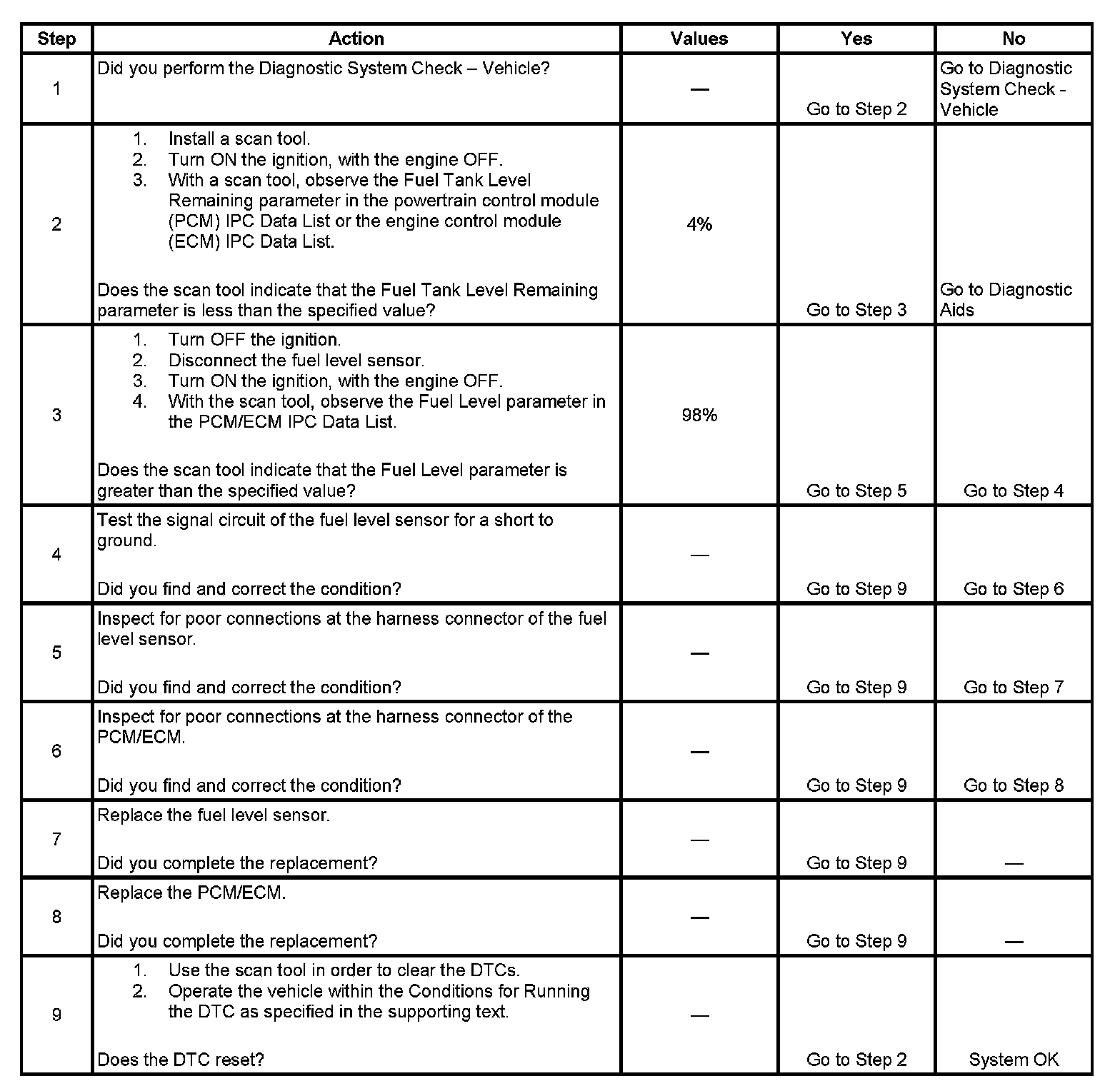 The number below refers to the step number on the diagnostic table.