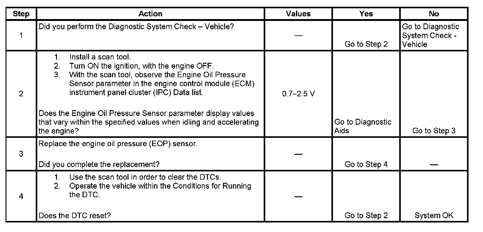 The ECM does not detect a change in the EOP of at least 34.5 kPa (5.0 psi) over a predetermined variance of the engine speed.