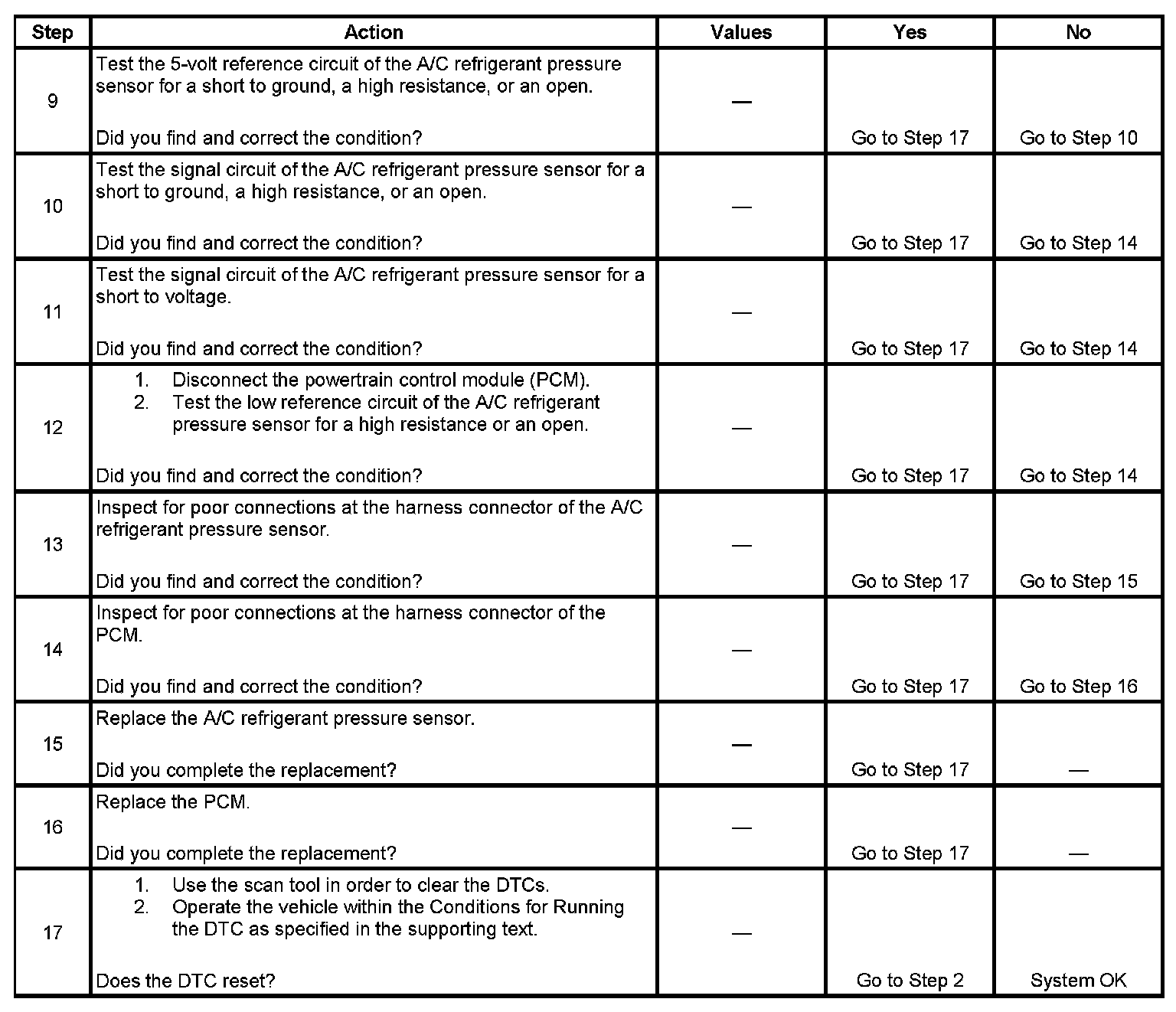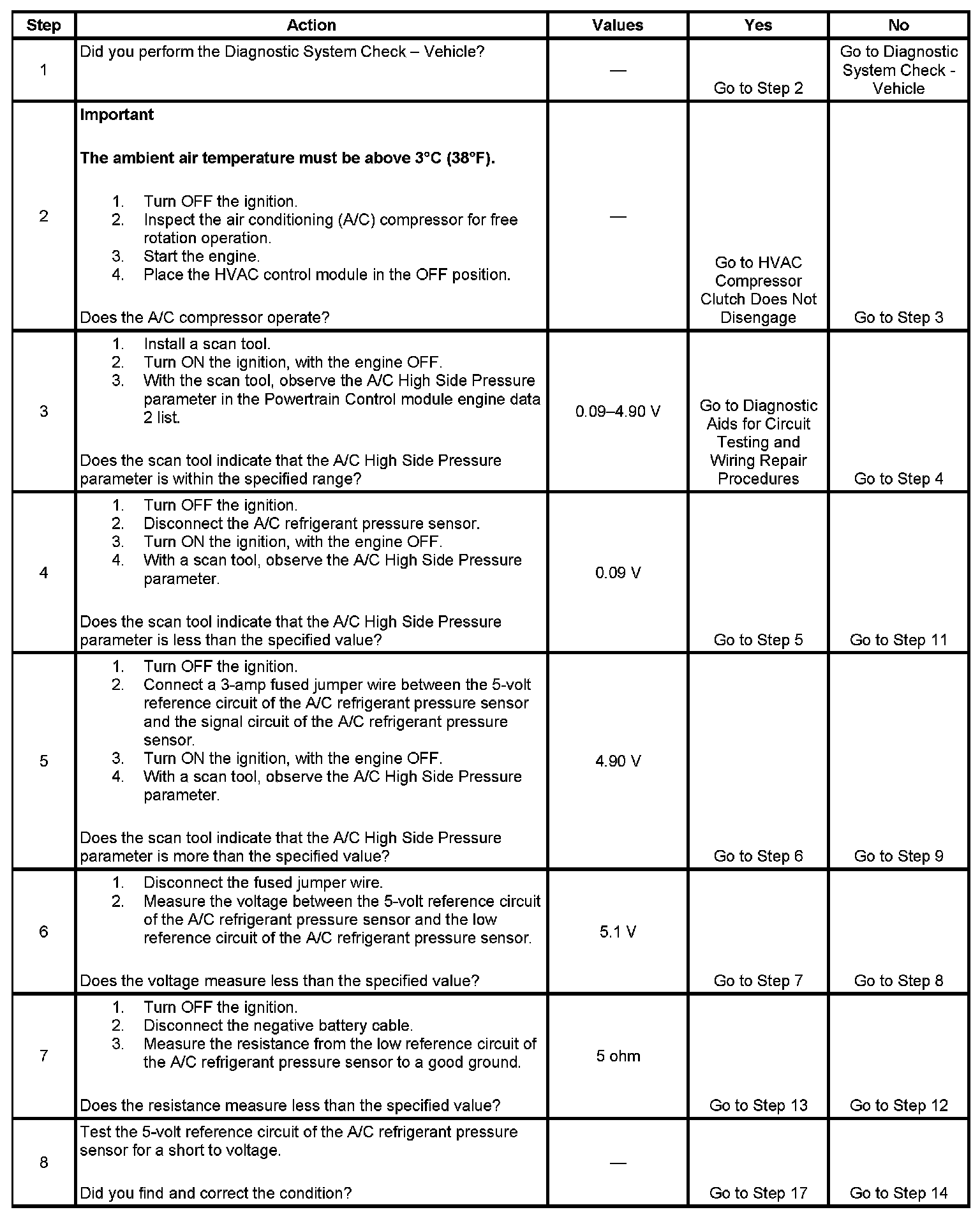 The numbers below refer to the step numbers on the diagnostic table.