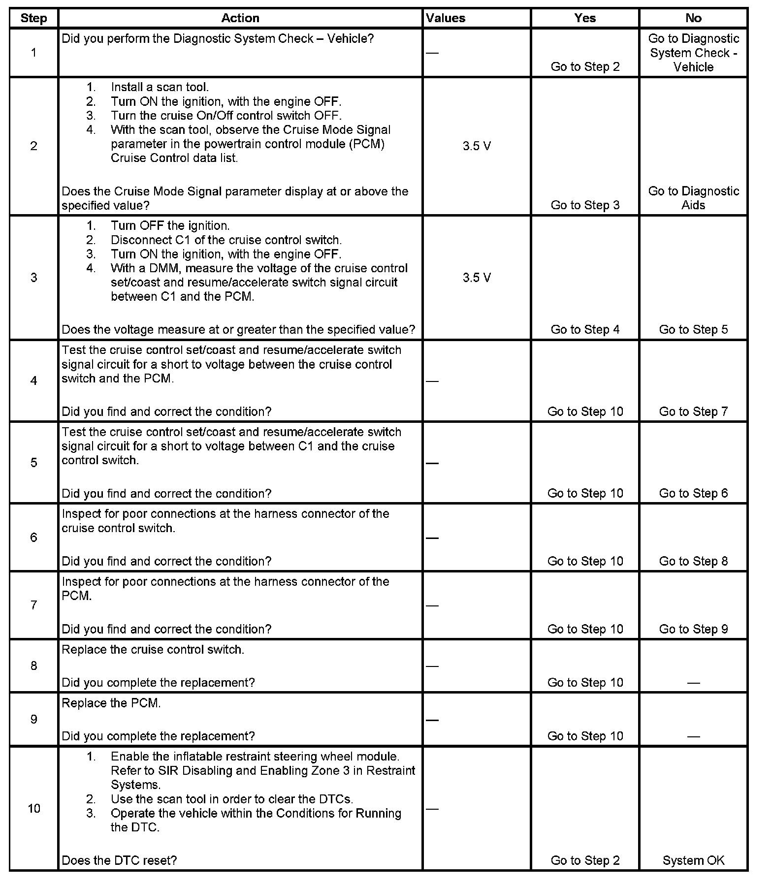 Rotate the steering wheel to both steering stops and activate each cruise control switch separately. With a scan tool, observe the associated Cruise Control Switch parameter in the PCM Cruise Control data list. This will help eliminate the possibility of an internally shorted inflatable restraint steering wheel module coil.