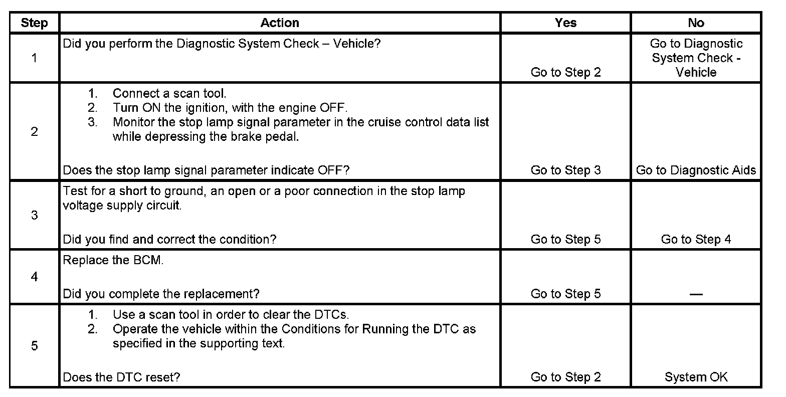 The body control module (BCM) receives a signal from the brake pedal position sensor through the stop lamp switch signal circuit. The BCM then applies voltage through the stop lamp voltage supply circuit to the PCM, EBCM and the stop lamps.