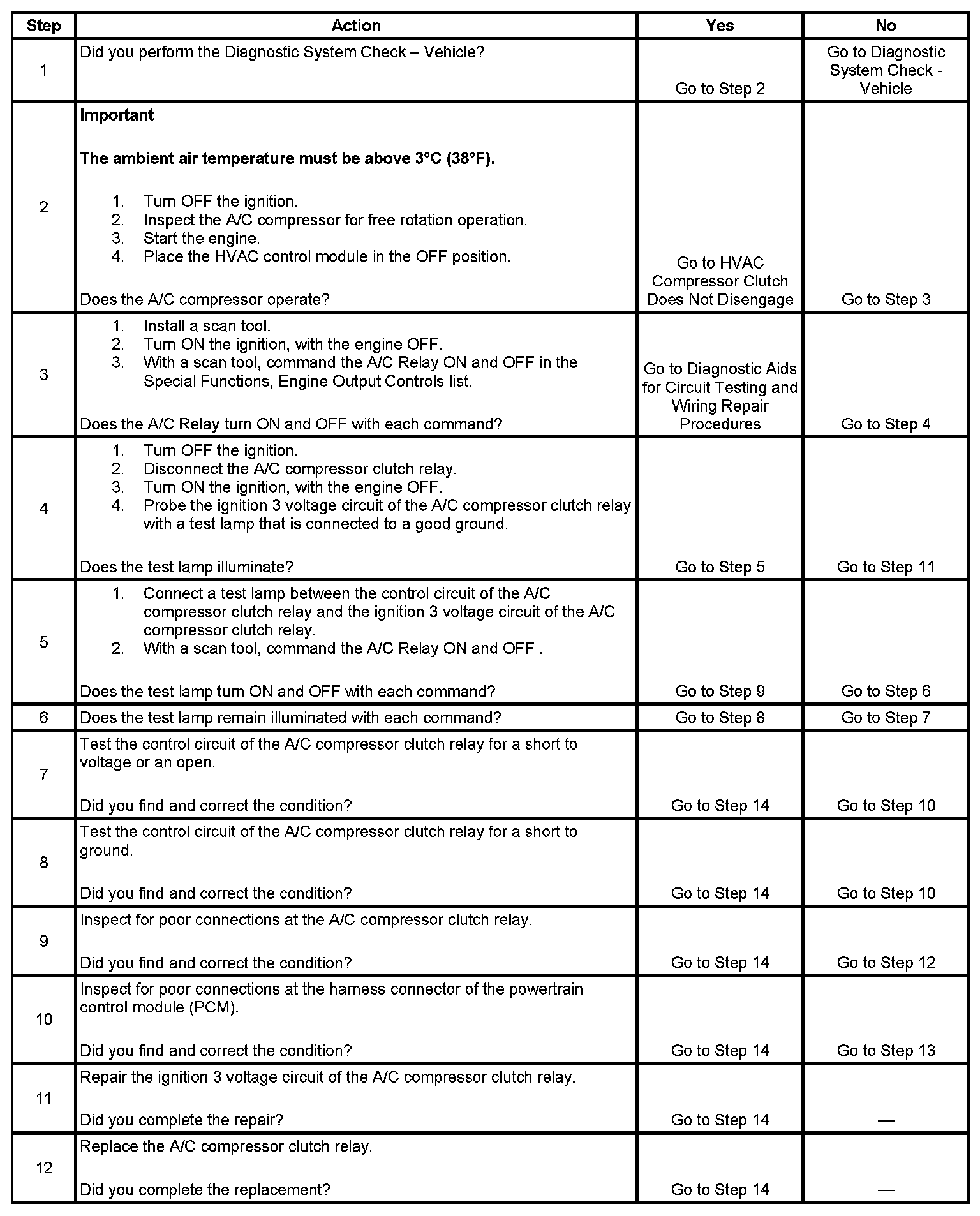 Ignition voltage is supplied directly to the A/C compressor clutch relay. The powertrain control module (PCM) controls the relay by grounding the control circuit through an internal solid state device called a driver. The primary function of the driver is to supply the ground for the component being controlled. Each driver has a fault line which is monitored by the PCM. When the PCM is commanding a component ON, the voltage of the control circuit should be near 0 volts. When the PCM is commanding the control circuit to a component OFF, the voltage potential of the circuit should be near battery voltage.