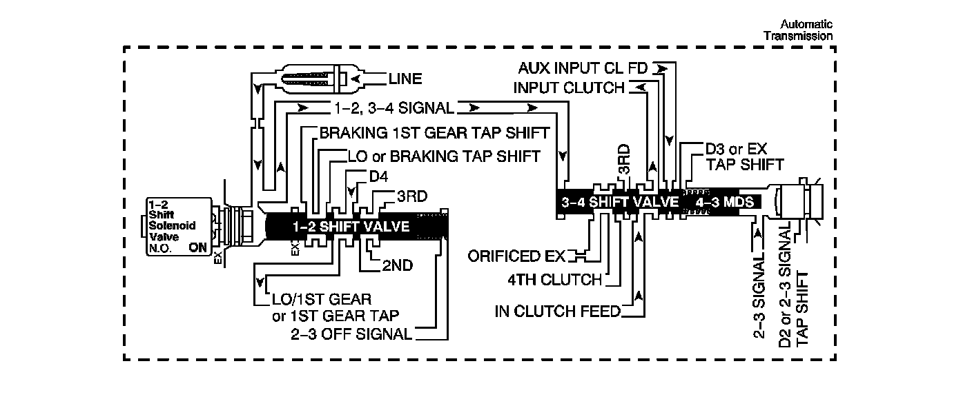 The 1-2 shift solenoid (1-2 SS) valve is supplied with fused ignition voltage. The ground path is controlled by the PCM. When the PCM commands the solenoid OFF, a ground path is not provided and the filtered line pressure that is fed to the solenoid is exhausted. When the PCM commands the solenoid ON, a ground path is provided and the exhaust port is blocked, stopping the exhaust of line pressure.
