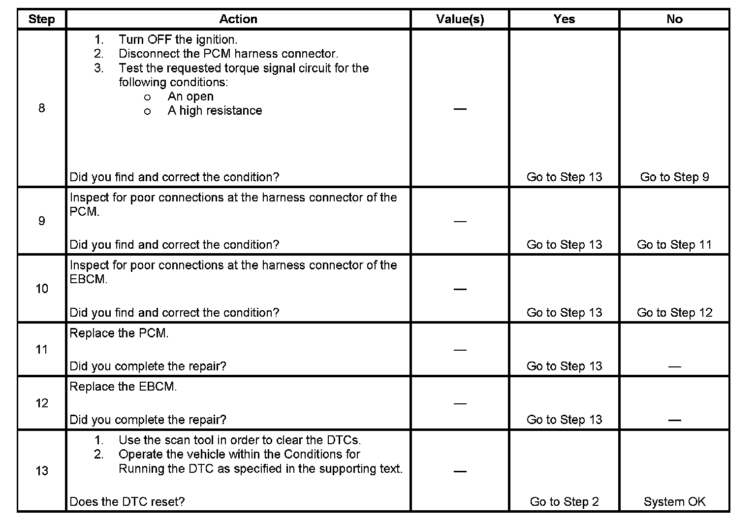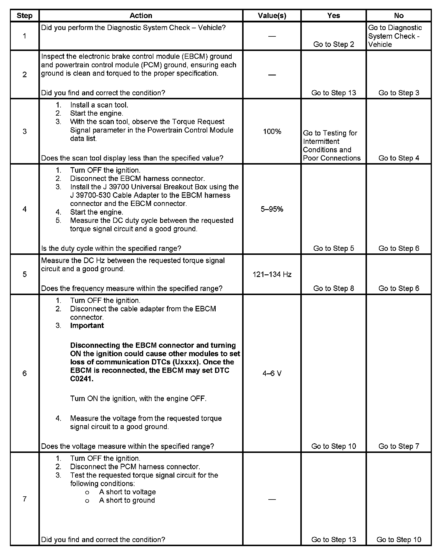The PCM diagnoses the requested torque PWM signal circuit and sends a class 2 serial data message to the EBCM indicating a fault is present. A fault exists in the circuit if the PCM detects one of the following conditions: