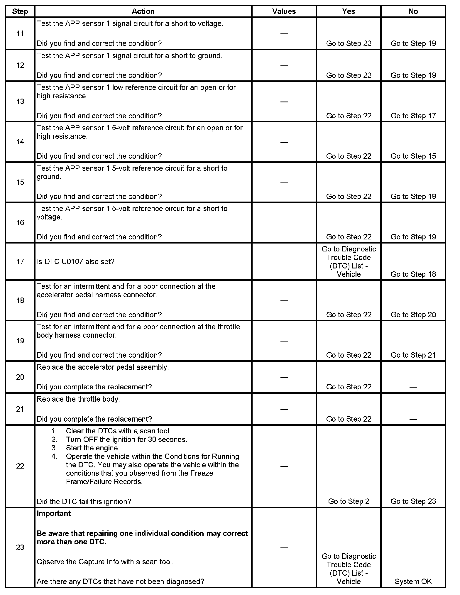 - The APP sensor 1 voltage is less than 0.235 volt or more than 4.487 volts. OR