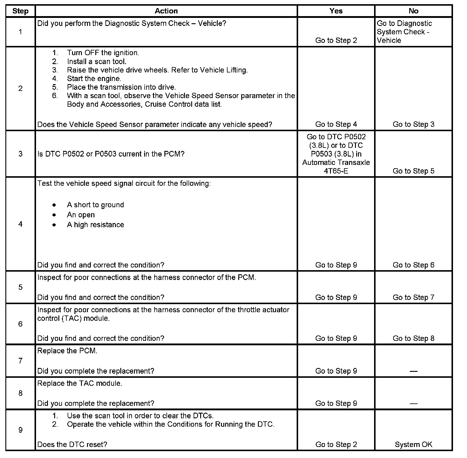 The vehicle speed signal circuit is an input to the throttle actuator control (TAC) module from the powertrain control module (PCM). The PCM provides a constant voltage signal on the vehicle speed signal circuit. The PCM creates the vehicle speed signal by internally pulsing the vehicle speed signal to ground. The TAC module uses the vehicle speed signal from the PCM, in order to determine the vehicle speed. The TAC module then sends a universal asynchronous receiver transmitter (UART) serial data message to the PCM indicating the vehicle speed that the TAC module has detected.