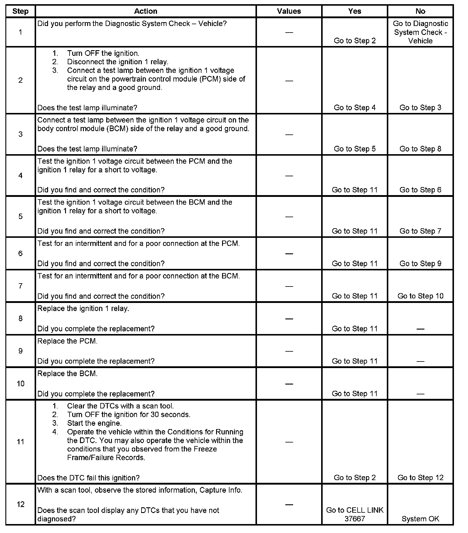 The ignition 1 relay is controlled by the body control module (BCM). The ignition 1 relay contacts are supplied a hot at all times from the fuse block underhood. The relay supplies power to several components when the vehicle is in the RUN or CRANK power mode. When the ignition switch is placed in the RUN or CRANK position, the BCM will receive an ignition 1 signal from the ignition switch and turn ON the ignition 1 relay. When the ignition switch is in the OFF position, the BCM will turn OFF the ignition 1 relay. The powertrain control module (PCM) compares the ignition 1 relay output signal with the BCM class 2 serial data power mode message. If the ignition 1 voltage signal and the power mode message do not match for an allotted time, the PCM will disable the fuel injectors and DTC P2535 will set.
