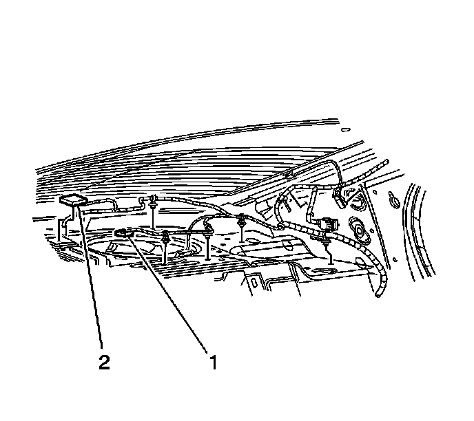 3. Use a small wide-bladed plastic tool to release the adhesive. Remove the navigation antenna (2) from the rear shelf.