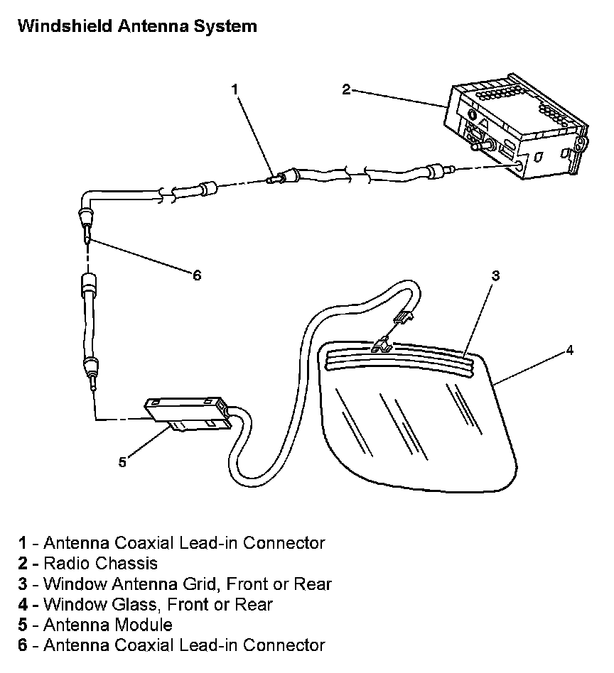This antenna system uses two antennas to form a diversity system. The primary antenna is part of the rear window. The primary antenna receives both AM and FM signals. The secondary antenna is located on the passenger side of the windshield. The secondary antenna receives only FM signals. The radio antenna module processes the antenna reception signals and phase aligns them to create one strong signal.
