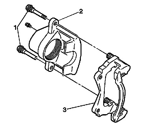 Remove the caliper pin bolts (1). Note the location of the caliper pin bolts. The leading caliper pin, or top bolt, has a bushing as part of the assembly. The trailing caliper pin, or bottom bolt, is a solid design.